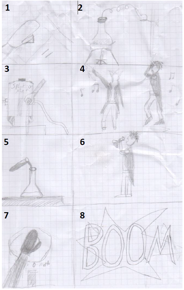 Der Professor ist ziemlich verrückt und wagt auch mal gefährlichere Experimente und trinkt die Chemikalie. Hauptmusik läuft im Hintergrund.