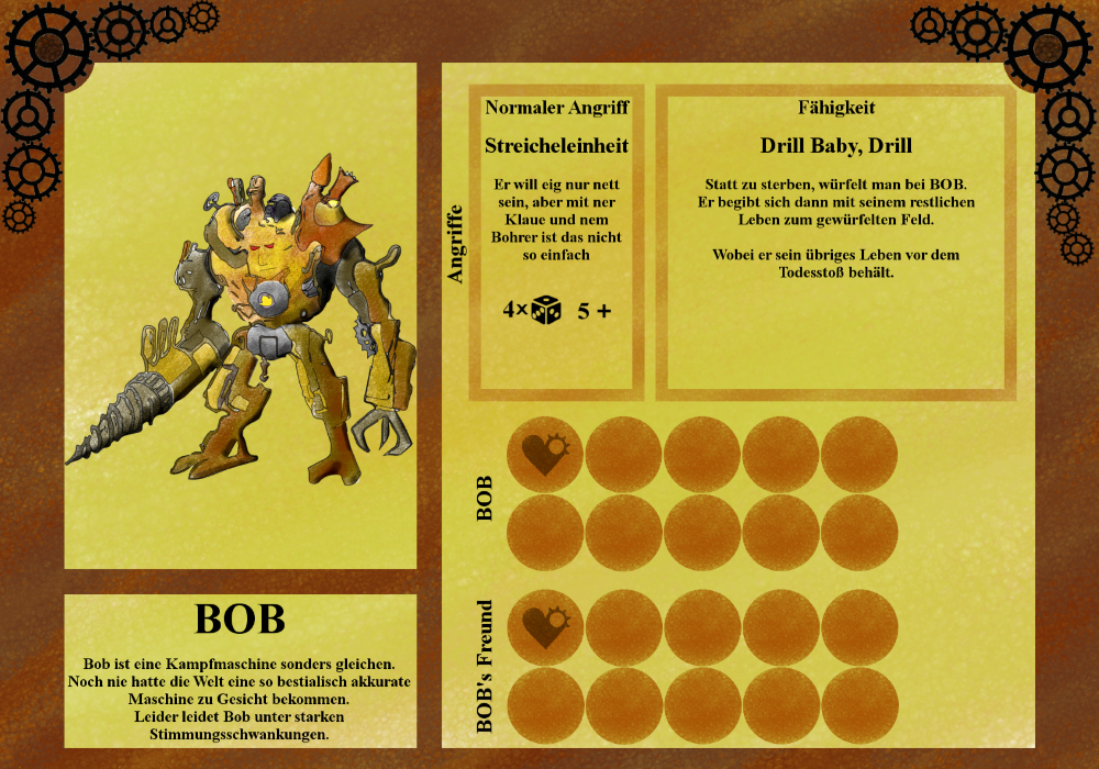 BOB ist der Tank unter den Maschinen! Im Angriff ist er nicht allzu gefährlich aber es braucht seine Zeit, um ihn zu besiegen. Mit seiner Passiven Fähigkeit bleibt er am Leben auch nachdem er besiegt wurde und ist somit ein ständiger Dorn im Auge der Helden.