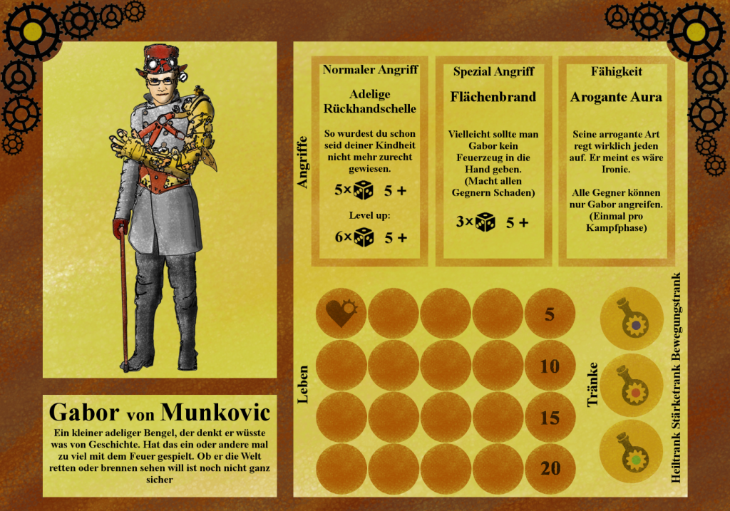 Der Anführer Gabor von Munkovic ein Adeliger aus einem der ältesten Adelsgeschlechter mit exzellenten Beziehungen und ein Meister der Fechtkunst. Bei einem Kampf während eines Arbeiteraufstandes verlor er seinen rechten Arm, doch er engagierte die besten Ingenieure des Reiches, um ihm einen künstlichen Maschinenarm zu bauen. Dieser vermochte es sowohl zarte Damenhand zu halten als auch tödliche Hiebe auszuteilen, außerdem hielt er für jeden Gegner noch ein paar Überraschungen bereit.