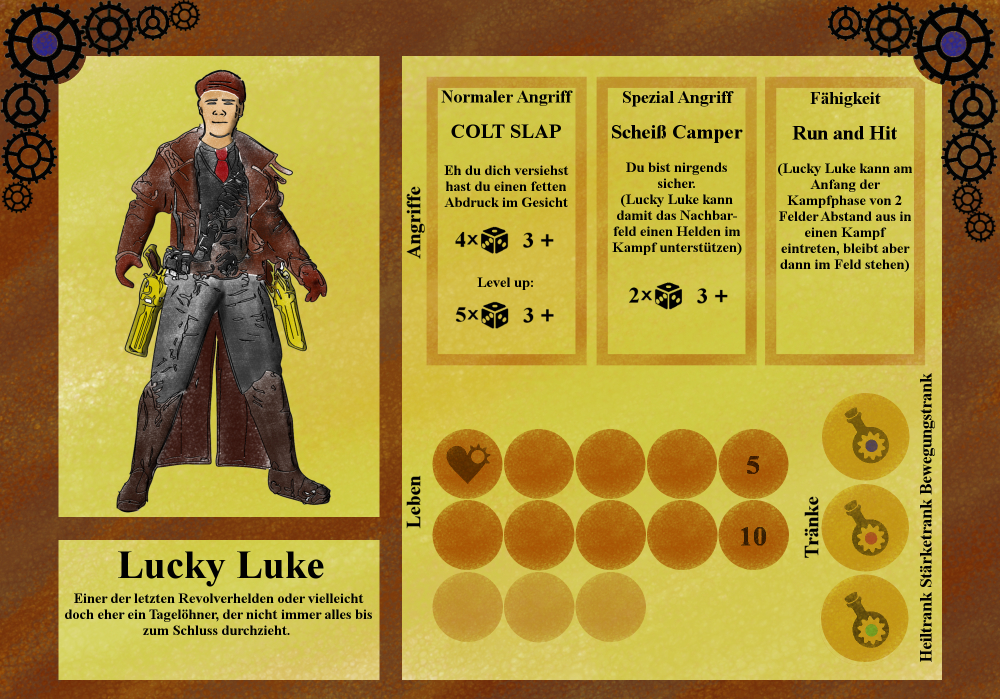 Das jüngste Mitglied war Lucky Luke, ein Revolver schwingender Bandit der aufgrund seiner nützlichen Beziehungen zum Untergrund so wie seiner beeindruckenden Präzision mit dem Colt, selbst unter ständigem Whiskey Einfluss in die Garde aufgenommen wurde. Er war ein Rüpel vor dem Herrn und scherte sich nicht wen oder was er aus dem Weg räumen muss, um sein Ziel zu erreichen.