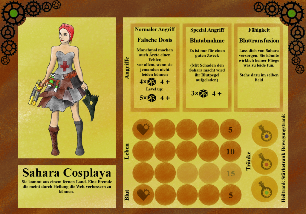 Die Heilerin Sahara Cosplaya war ein genialer Physikus, sie wurde zur obersten Hofärztin als alle anderen Bewerber auf “sonderbare” Weise an einer seltsamen Krankheit starben. Ihre Forschungen revolutionieren die Medizin des Kaiserreiches und auch im Kampf wusste sie ihr Wissen um Anatomie und Arzneien geschickt einzusetzen, um ihren Gegnern ein möglichst schmerzvolles Ende zu bereiten.