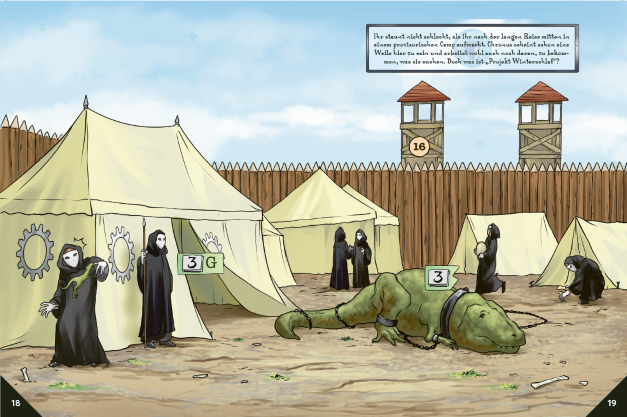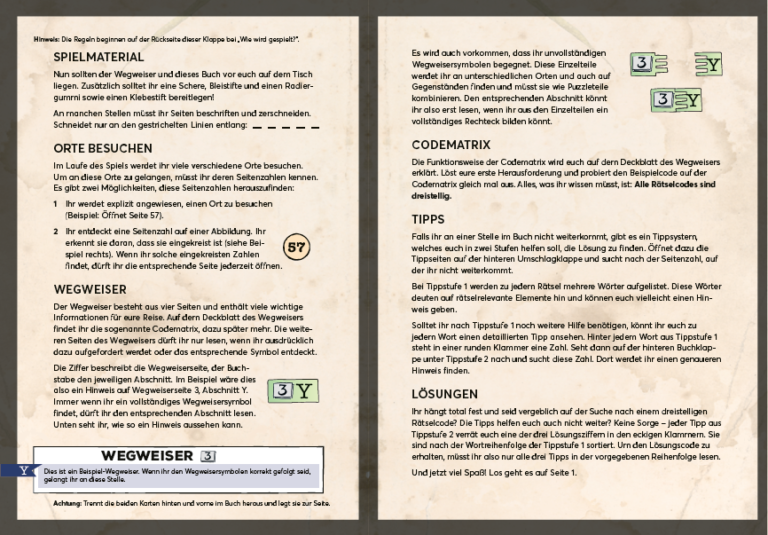 Dieses Rätselspiel bietet sogar eine offene Spiellwelt. Die Spieler können sich frei auf der Karte bewegen, wobei jeder Standort mit einer Seite des Buches verbunden ist. Durch Fortschritt im Spiel werden neue Bereiche freigeschaltet und ebenfalls auf dert Karte eingetragen. Um im Spiel voranzukommen, können die Spieler mit verschiedenen Charakteren interagieren, Objekte und Gadgets finden, die sie ausschneiden und benutzen können, und damit neue Bereiche erschließen oder neue Rätsel zu lösen. Dieses Buch enthält außerdem eine zweite XXL-Karte, mit der eine interaktiven Zeitmaschine gebastelt werden kann, um durch Zeit und Raum zu navigieren. Die Zeitmaschine selbst ist ebenfalls ein kleines Rätsel.