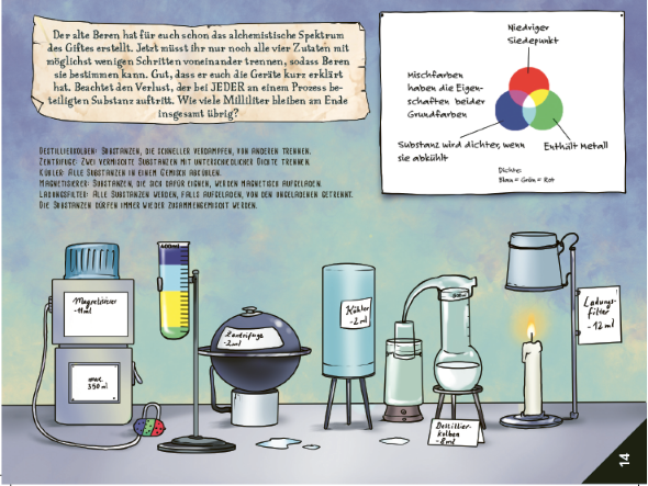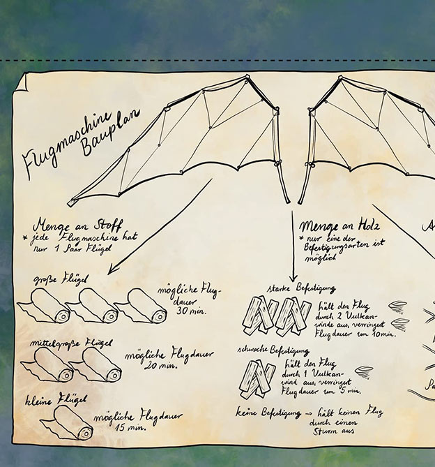 Dieses Rätselspiel bietet sogar eine offene Spiellwelt. Die Spieler können sich frei auf der Karte bewegen, wobei jeder Standort mit einer Seite des Buches verbunden ist. Durch Fortschritt im Spiel werden neue Bereiche freigeschaltet und ebenfalls auf dert Karte eingetragen. Um im Spiel voranzukommen, können die Spieler mit verschiedenen Charakteren interagieren, Objekte und Gadgets finden, die sie ausschneiden und benutzen können, und damit neue Bereiche erschließen oder neue Rätsel zu lösen. Dieses Buch enthält außerdem eine zweite XXL-Karte, mit der eine interaktiven Zeitmaschine gebastelt werden kann, um durch Zeit und Raum zu navigieren. Die Zeitmaschine selbst ist ebenfalls ein kleines Rätsel.