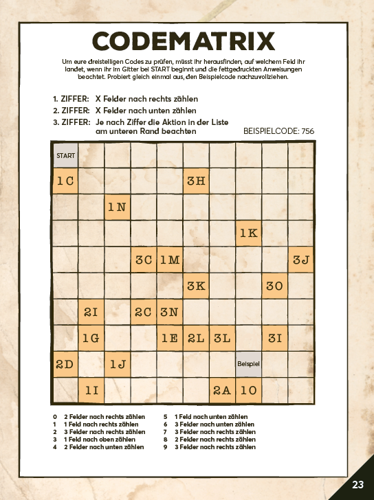 Die Lösung für jedes Rätsel besteht aus einer dreistelligen Zahl. Mit der Code-Matrix können die Spielenden überprüfen, ob sie die richtige Antwort gefunden haben. Wenn ihre Zahl richtig ist, führt die Code-Matrix die Spielenden zu einem Hinweis. Der beschreibt die Aktion, welche durch das Lösen des Rätsels ausgelöst wurde, und schickt sie zu einer neuen Seite oder einem freigeschalteten Objekt.